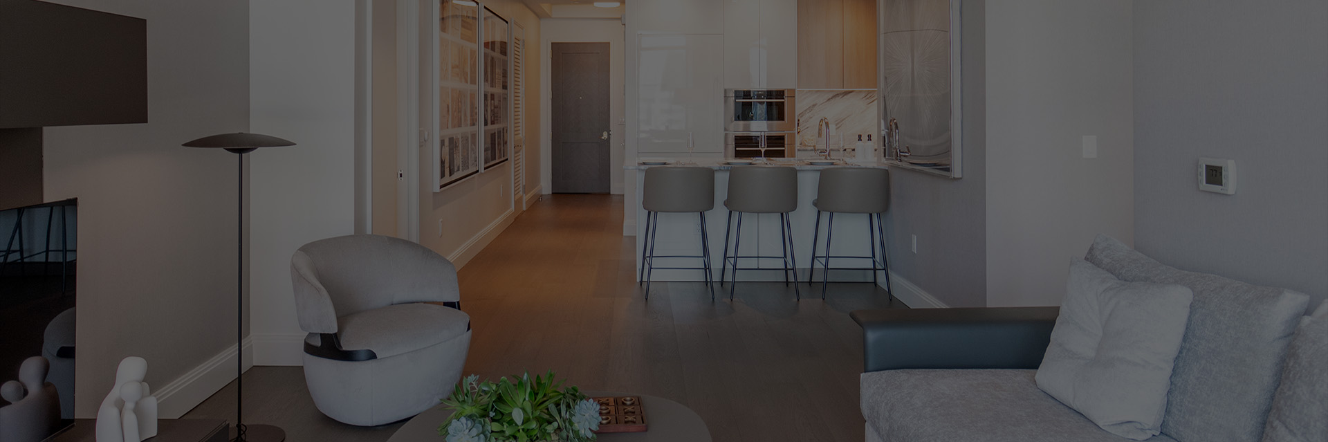 Enter through the roomy foyer with extra storage closet into a beautiful, airy living space. The warm color palette and curated artwork are sophisticated and welcoming.