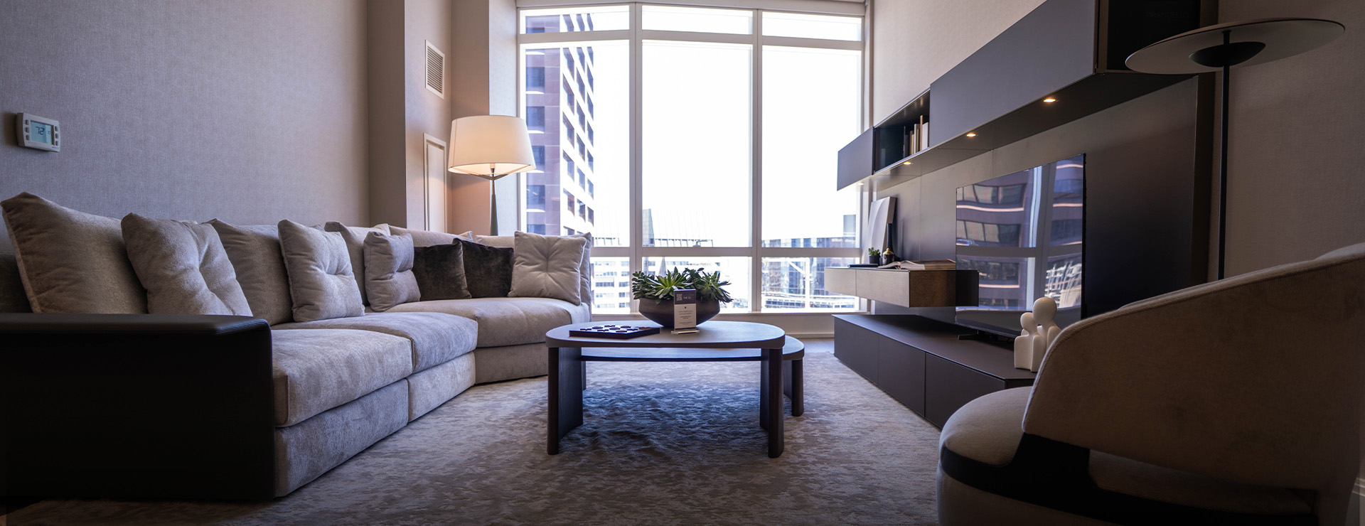 This 2-bedroom, 2.5 bath + flex room residence in the sky definitely breaks from the herd. Hands down, it’s our most glamorous turnkey home with a formal dining room and massive island—an entertainer’s dream. The stunning sunset views over the Charles River add to the wow factor. But what really sets this home apart is the off-the-charts custom storage.