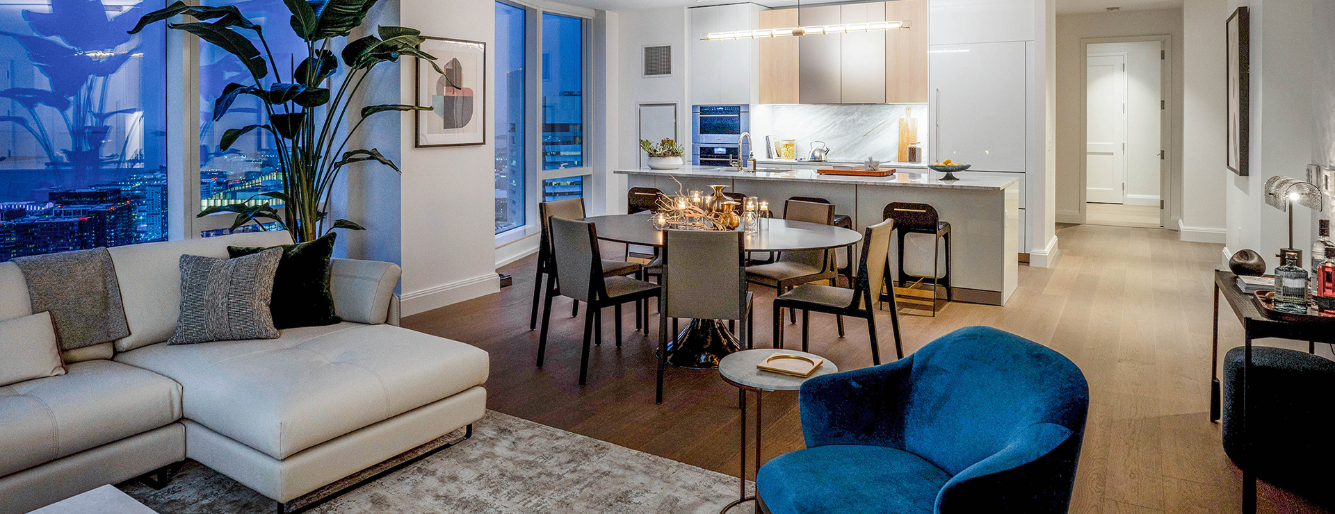 This impressive corner home features 2-bedrooms and 2.5 baths with 46 feet of linear glass in the main living space. But the first thing you’ll notice is that the kitchen is nothing less than mind-blowing, with a gorgeous view of Boston as a backdrop—quite possibly our most beloved kitchen layout.
